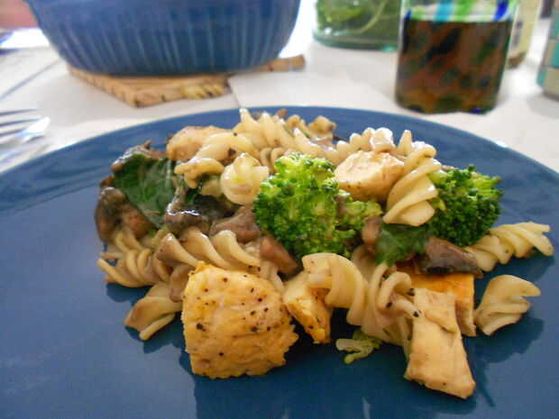 Me encanta, pero sobre todo porque me encanta el brocoli, champiñones y pastas. Oh sí, tiene pollo (es el nombre del plato...)