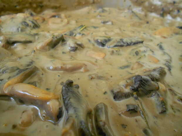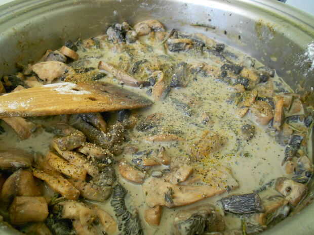 Así que lo que tienes que hacer es añadir la harina con movimientos rápidos de la muñeca. Sí, por favor: las manos, no directamente en el envase que puede ser difícil de manejar. Es importante ir despacio en este paso, porque la harina tiene que cocer antes de añadir más. Cuando los hongos pegajosos con harina, comenzar a añadir la leche, poco a poco, hasta obtener la consistencia del deseo. Comprobar de sal y pimienta y si es necesario, agregar más.