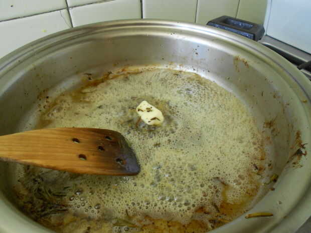 En la misma sartén donde estaba el pollo, dejar caer accidentalmente mitad de una barra de mantequilla y raspar el fondo de la cacerola, hasta que todos los jugos del pollo delicioso y aceite restante de la mezcla junto con la fusión de la mantequilla.