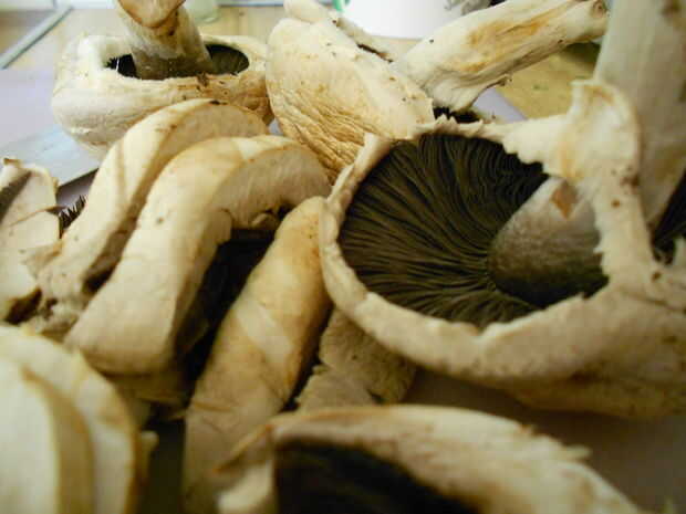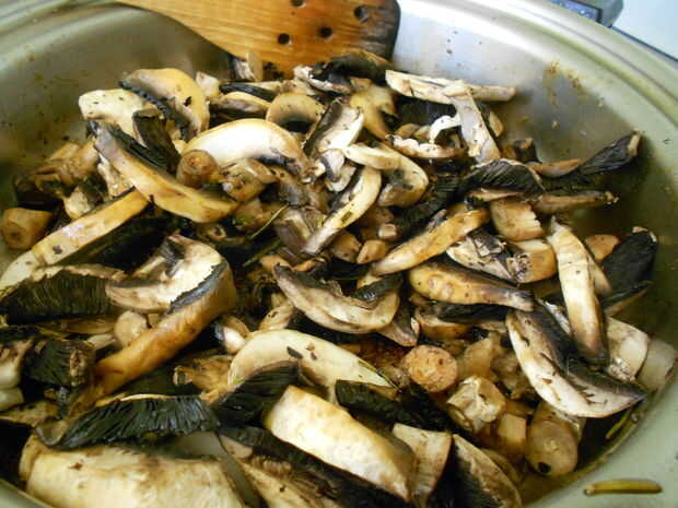 Por lo tanto, empezar con medio kilo de setas (1 / 4lb) blanco portobellini o champiñón. Corte, esta vez no tan pequeño, porque te encoja con el calor.
