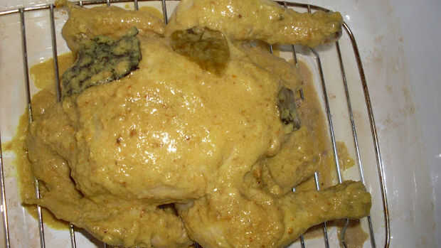 Sacar el pollo pan y lugar en la parrilla de asar (o pan de Turquía con una rejilla de asar)