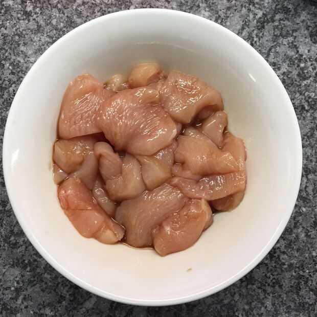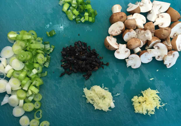 Rebane finamente el pollo y marinada en la salsa de soja y vino de arroz durante 30 minutos. Picar las cebolletas, rallar el ajo y el jengibre, reducir a la mitad o cuarto los champiñones, picar aproximadamente los frijoles negros. Reservar algunos trozos verdes de cebolla para la guarnición.