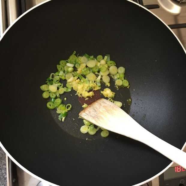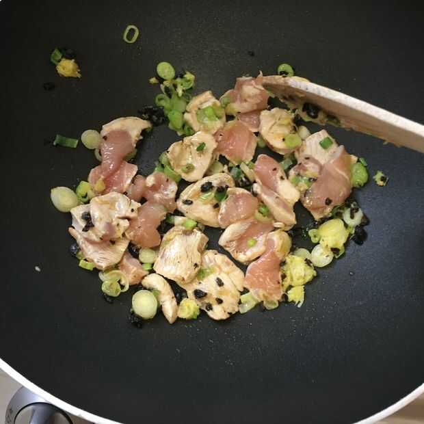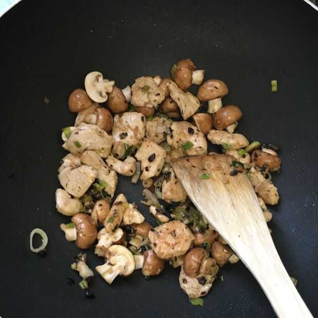 Calentar el aceite en un wok a fuego alto, agregar el ajo, jengibre y cebollas y freír durante 30 segundos. Añadir el pollo y frijoles negros y sofría hasta que el pollo se está convirtiendo a blanco. Añadir las setas y freír durante un minuto.