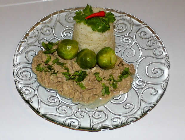 Esto es una comida tradicional en la República de Georgia, llamado Satsivi. Tenemos generalmente con pan pero lo sirvo con arroz como arroz es popular en Gran Bretaña.
