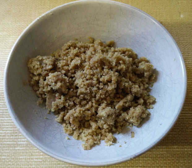 y se mezcla todo con la mano. Redondear la mezcla en pequeñas bolitas y reservar.