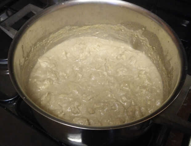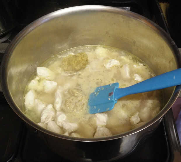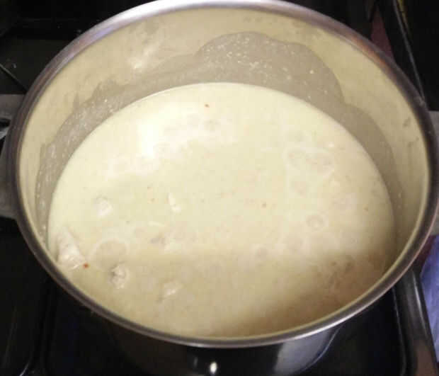 Después de hervir a fuego lento el pollo por aproximadamente una hora comenzar a añadir la mezcla de la bola de nuez en él (uno por uno). Remover que toda la nuez en hasta que se disuelva completamente. mantener a fuego lento durante 10-15 minutos hasta que la mezcla espese hasta.