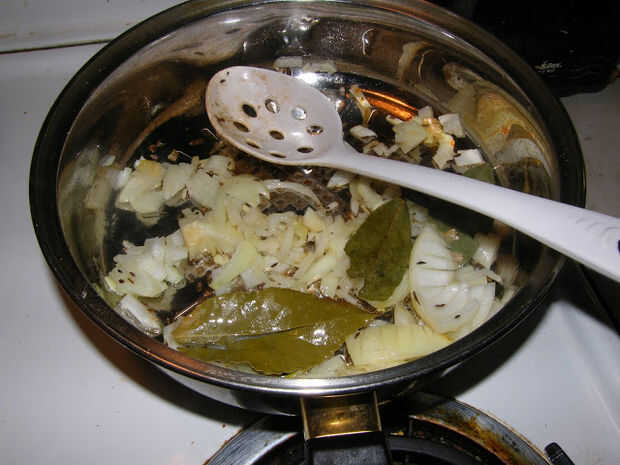Calentar aceite y freír las semillas de comino. Añadir cebolla picada y hojas de laurel, remover y freír durante 2 minutos