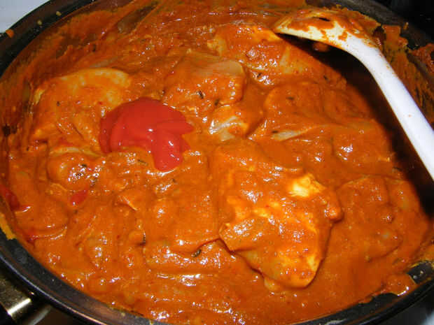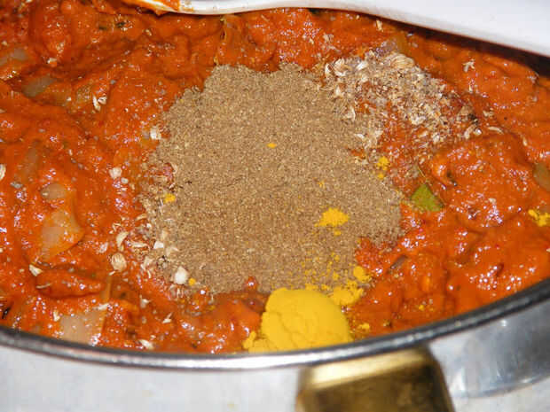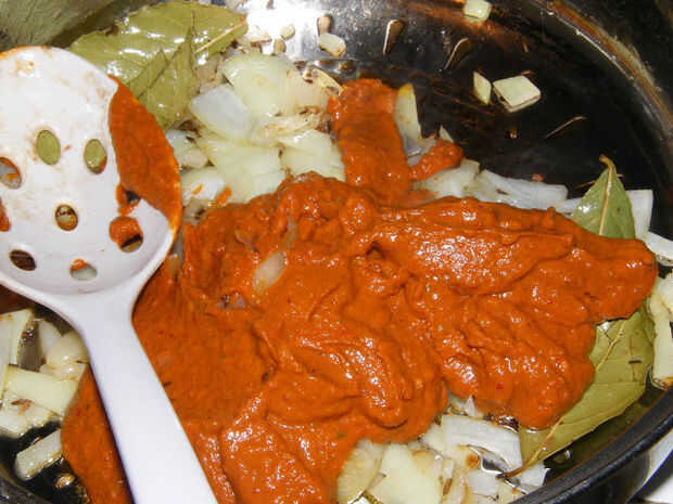 Lugar rápido curry pasta verde chiles, chiles secos, ajo, sal, azúcar, Chile en polvo, pimentón en polvo, puré de tomate + agua en una licuadora, procesan hasta obtener una pasta fina