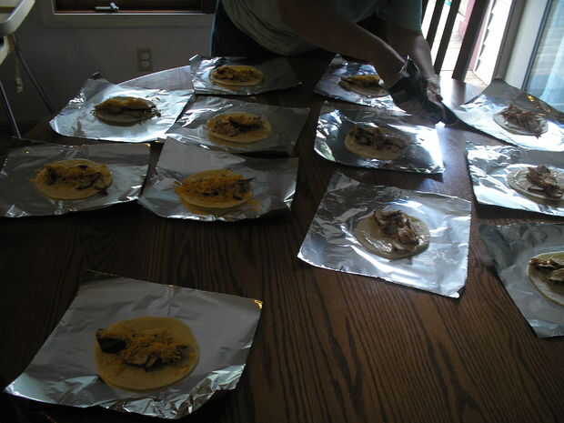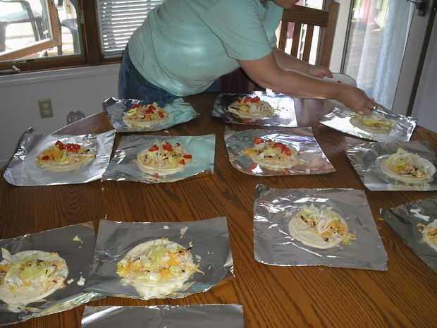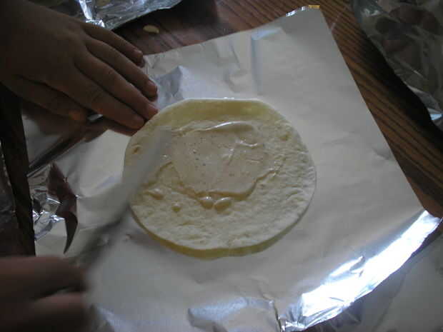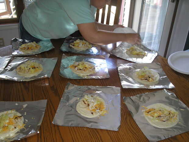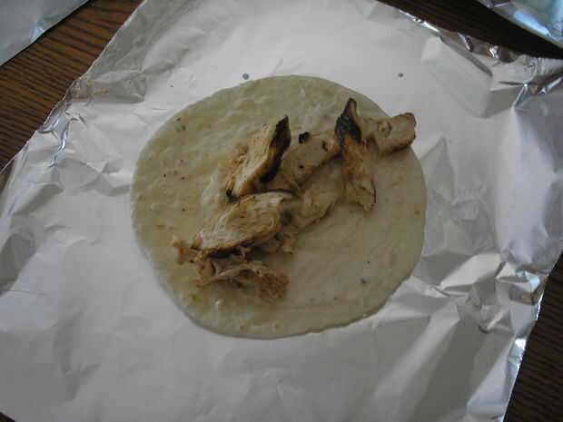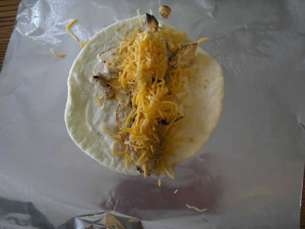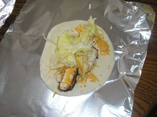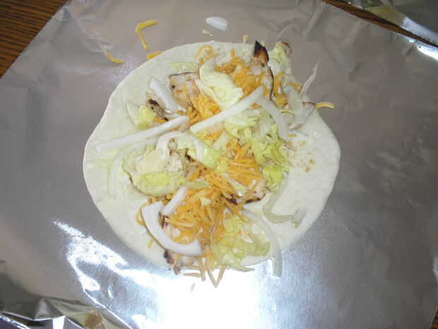 1. Put Down a square of tin foil 2. Agregue la Tortilla 3. Unte el aderezo para ensaladas César en tortilla 4. Agregue el pollo, queso, lechuga, cebollas y tomates (en cualquier orden que desee)
