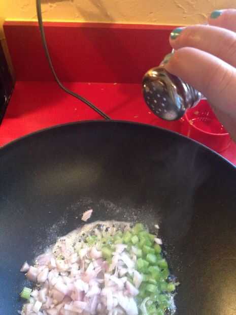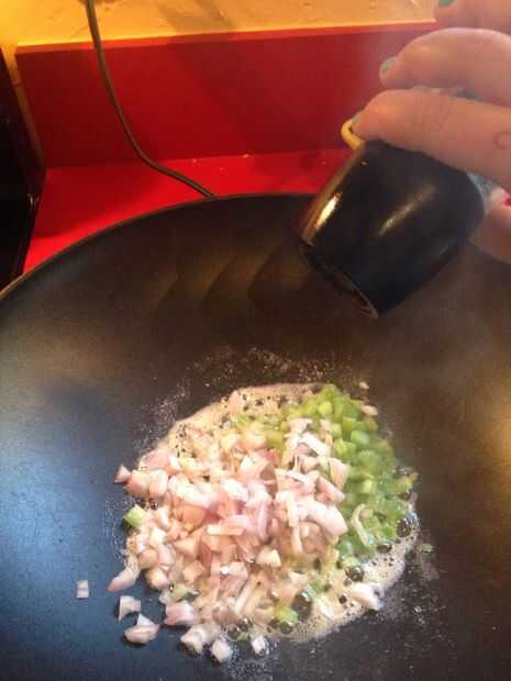 Gire a la cacerola a fuego alto. Añadir la mitad de la mantequilla a la sartén y deje que se derrita. Añadir el apio y la cebolleta en la mantequilla. Sazonar con sal y pimienta. Freír hasta que estén translúcidos pero no quemado. Si tiene un poco quemado está bien, no afectará el sabor.