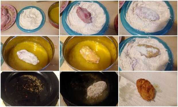 5. tomar un ala de pollo, dragar en la mezcla de harina, y luego sumerja en la mezcla de huevo. Ahora, otra vez capa lo bien en la mezcla de harina.