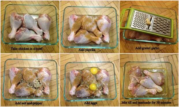 Tomar pollo en tazón. Agregar huevos, ajo rallado, pimentón, sal y pimienta. Mezcla todo bien y marinada durante 30 minutos.