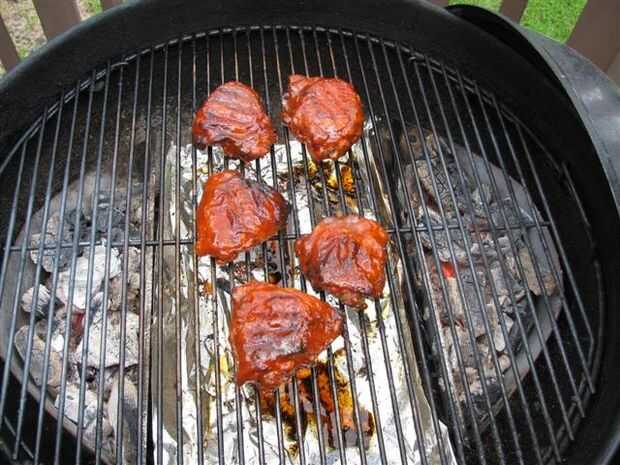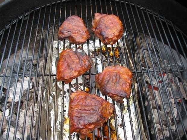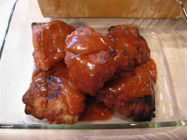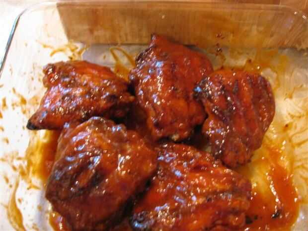 Como apuntan claramente a los jugos del pollo puede colocar los muslos en un recipiente y vierta la salsa sobre ellos. Asegúrese de que cada pieza está bien cubierto y luego coloque el pollo en la parrilla piel hacia por otros 10 minutos.