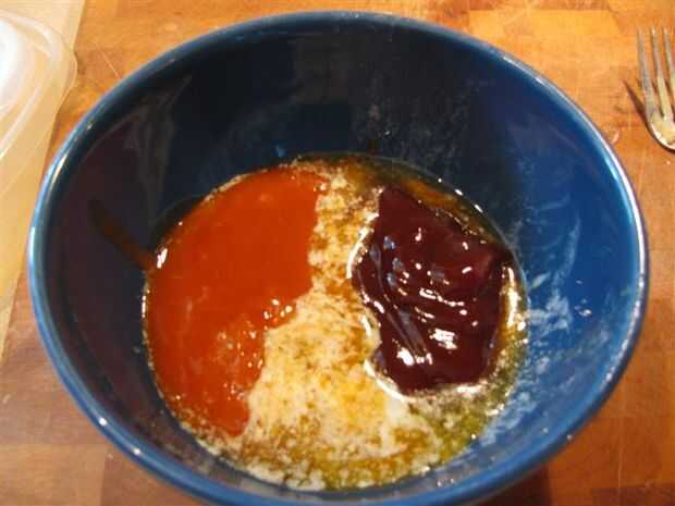 En un tazón Mezcle 1 tbs derretido mantequilla, 1/2 taza de salsa picante y 1/2 taza de la salsa de barbacoa favorita.