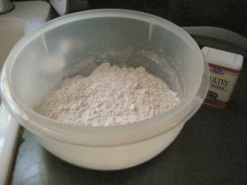 Combine 3 tazas de harina con las aves de corral 1 cucharada de aderezo en un recipiente grande con una tapa bien ajustada.
