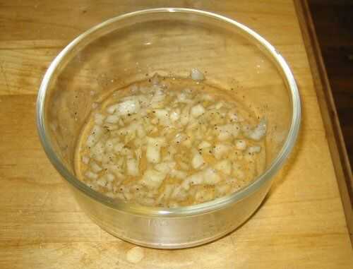 Combinar el vinagre de manzana, cebolla finamente picada y pimienta negra molida. Cuchara parte de esto sobre el fríjol.