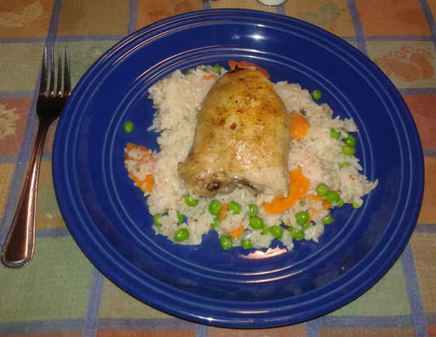 Por qué suculento al horno muslos de pollo marinados en salsa italiana. Servido sobre una cama de sabor acolchada infundido arroz, rodajas de zanahoria tiernas y guisantes al dente.
