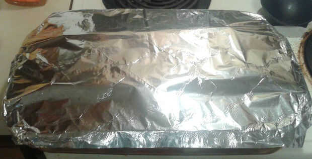 Algunos de los pollos se sentaron sobre el borde del plato para hornear, usé unos palillos para mantener el papel de aluminio de la carne cuando cubierto el plato.