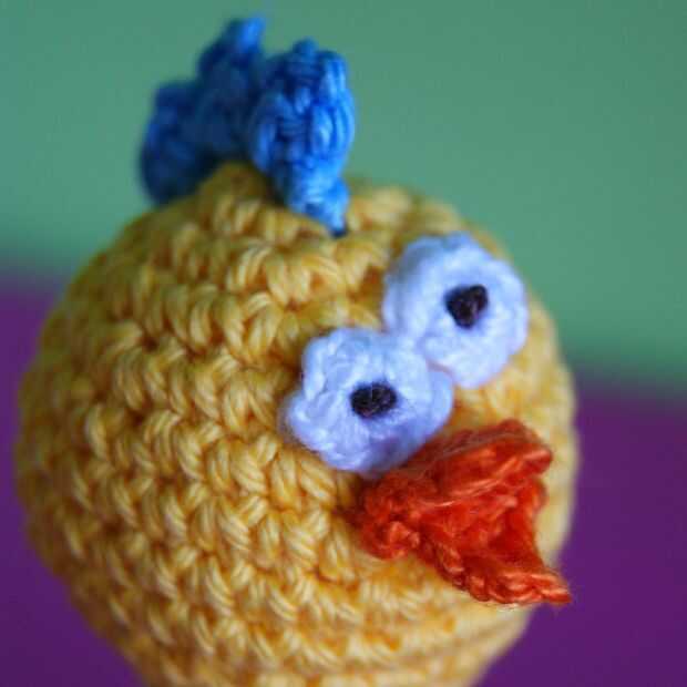 Una vez que el volante de ojos, el pico y la cabeza se cosen encendido, coser las pupilas en los ojos con pequeños nudos y el hilo de peso deporte (4ply) marrón.