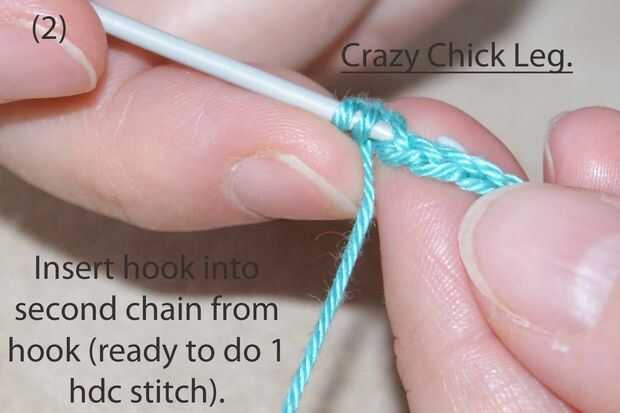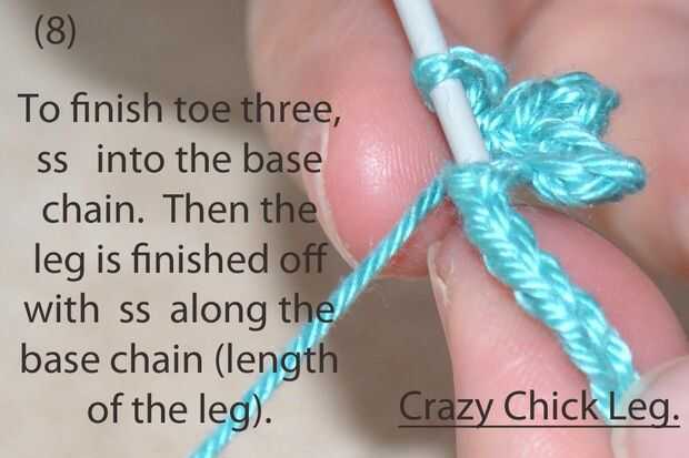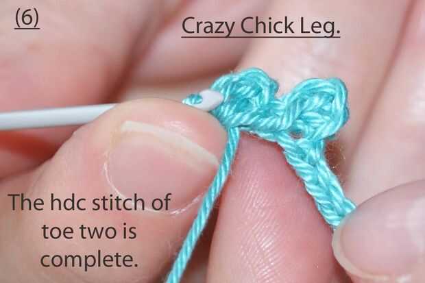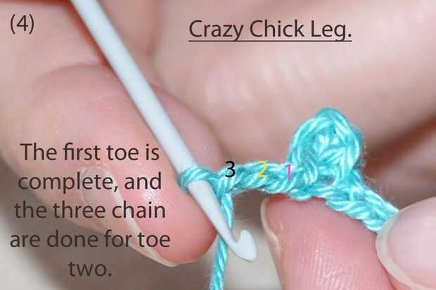 1 del dedo del pie: en la segunda cadena del gancho Ver foto (2) hacer 1 hdc  Ver foto (3) Dedo 2: No 3 cadena Dedo 3: No 3 cadena Para rematar la pierna, ss todo el camino a lo largo de la cadena base y elenco.  Unir los dos extremos del hilo.