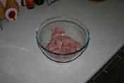 Cortar el pollo en trozos de 3cm y colocar en un recipiente no metálico