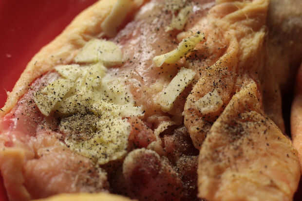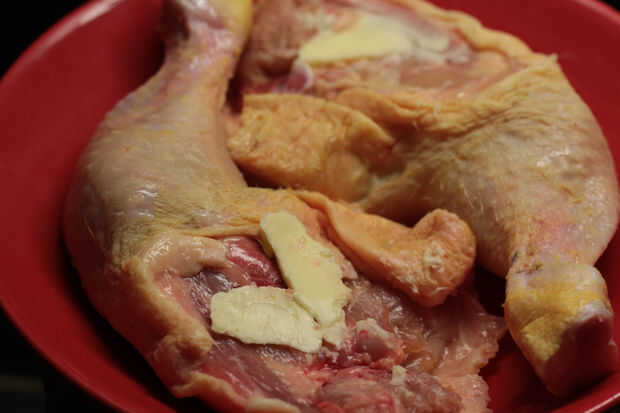 Tomar un trozo de mantequilla (puse una cucharadita) y frotar sobre el pollo, donde la piel no cubre la carne.