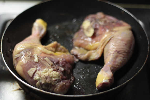 Puede meter un cuchillo en el pollo para asegurarse de que se cuece en el interior y si no, dejar que la sangre hacia fuera (a veces todavía sangra un poco) y el calor.