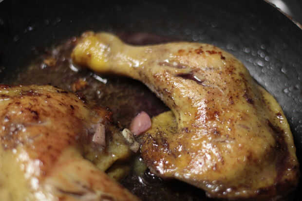 Ahora es el momento de verter el vino que quedó de la marinada, cubrir y dejar hervir por sobre otros 10 minutos hasta el púrpura del vino se ha convertido en un marrón más oscuro.
