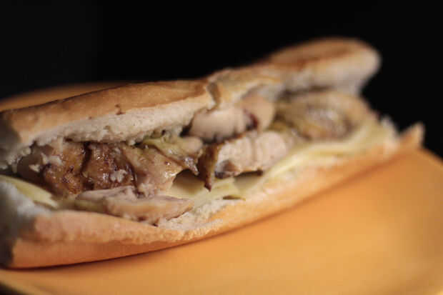 Corta la baguette por la mitad, o comer de todo, como usted desea. Corte abierto. Poner lonchas de queso, un poco de mantequilla (me encanta la mantequilla) y luego el pollo (previamente rallado).