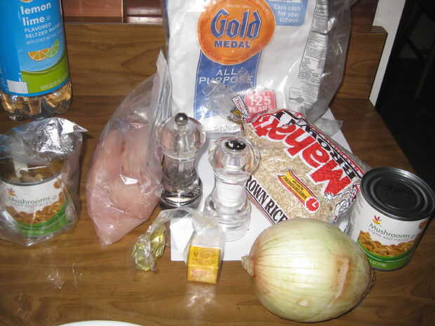 Para el pollo - pollo, setas (conservadas o no), cubo de caldo de carne.