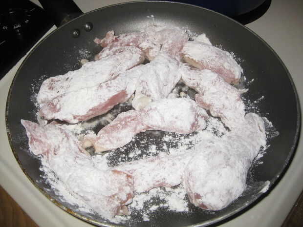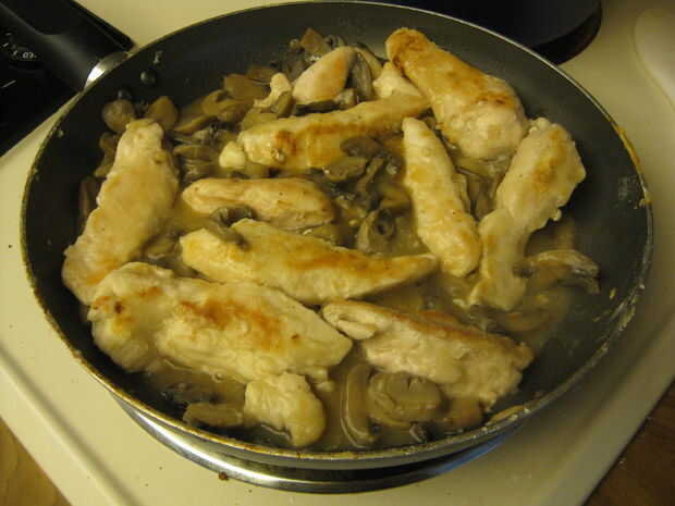 El pollo alrededor del rodillo en la mezcla de harina. Fracaso en la sartén. Freír (hasta que es marrón). Añadir sin embargo muchas setas que sientes como, un cubo de caldo y sobre media taza de agua (más fina). Cocinar 10 minutos o hasta que el pollo está listo.