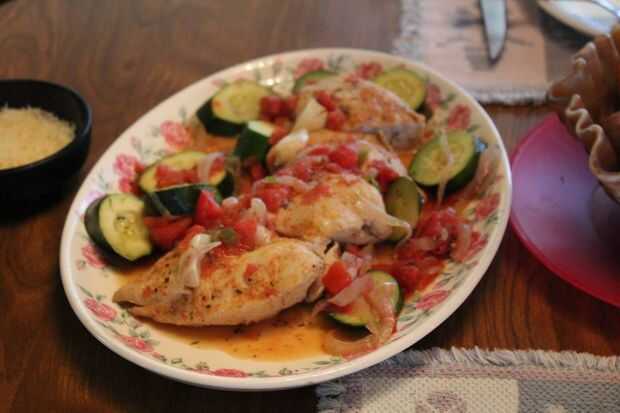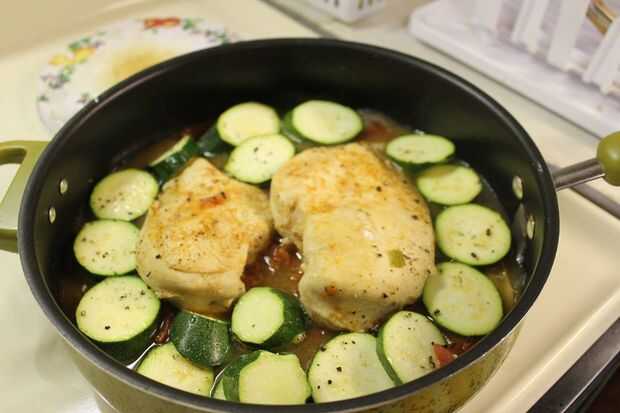 4. Cubra y deje para cocer a fuego bajo durante unos 10 minutos. Gire la pechuga de pollo encima y cocine por otros 5 minutos; luego coloque las rodajas de calabacín alrededor del pollo y cocinar cubierto por 15 minutos (todavía a fuego bajo). En este punto, el pollo debe estar bien cocida, pero aún tierna y jugosa, y el calabacín debe estar tierna pero quizás un poco crujiente. Retire el pollo y el calabacín en un plato; poner la bandeja de jugos a hervir durante unos pocos segundos y sirva sobre el plato. (Podría servir este plato con arroz si así lo desean; Recomiendo una mezcla de salvaje y arroz integral).