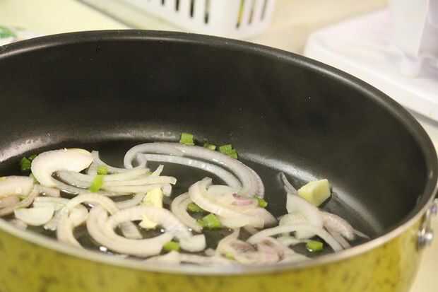 2. Coloque las rodajas de cebolla (y ajo si se usa) en la parte inferior de un frying pan antiadherente con tapa y cubrir con el caldo de pollo. Cocinar a fuego lento durante unos 10 minutos, o hasta que las rodajas de cebolla doradas