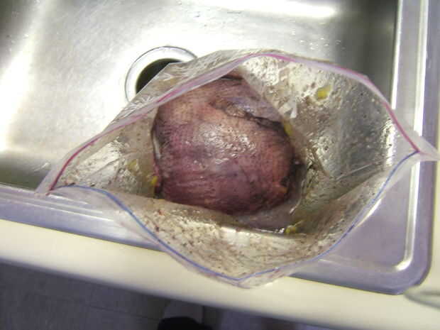 1. Tome todos los estómagos y basura hacia fuera y deshacerse de ellos. Deje que los jugos escurran durante un minuto y luego coloque el pollo en la bolsa.