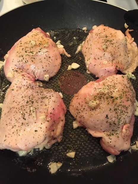 Poner en los muslos de pollo y deje cocinar en su primer lado durante unos 8-10 minutos.