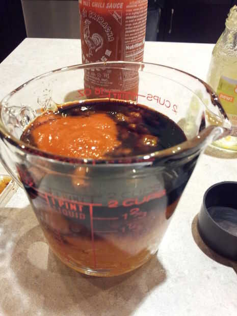 Usando la taza de medición le ayudará a calcular la cantidad de salsa de soja y puede que necesite añadir si usas un tarro de mermelada de naranja que tiene más o menos de 1.5 tazas de Sriracha.