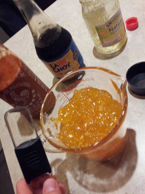 1/4 taza de mermelada de naranja + salsa de soja 1 cucharada + 1 cucharadita de Sriracha. (Yo uso un poco menos soja ultimamente y un poco más Sriracha)