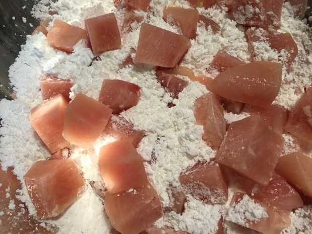 Dragar los trozos de pollo en el almidón de maíz, les capa uniformemente.