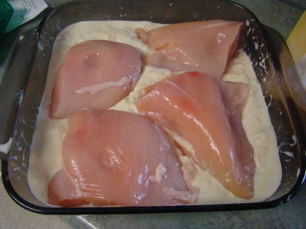 Pone los trozos de pollo encima de la mezcla de sopa de arroz.  (Ahora sería un buen momento para añadir una verdura que te interese, como brócoli.   Tengo varios amigos que hacen esto.  Mi Esposito no come brocoli, así que lo dejo.)