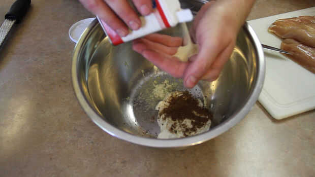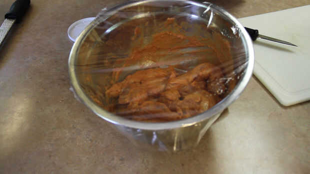 Mezclé un tercio de una taza de yogurt con algunas jengibre rallado (tal vez una media cucharada), unas 2 cucharaditas de garam masala, 2 cucharadas de pimentón, 1 cucharadita polvo de ajo, una pizca de sal, unas gotas de aceite para aflojar para arriba (yo usé aceite de mostaza), mezclan el desorden, mezcla en el pollo, lo cubrió para arriba y deja reposar durante la noche en la nevera.