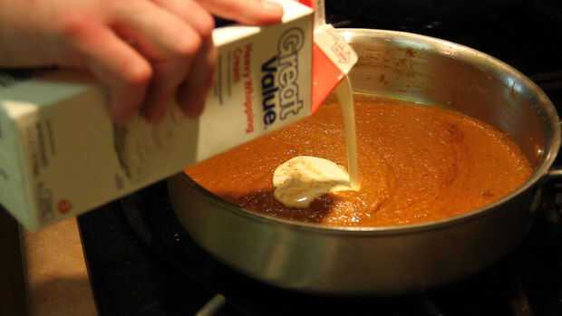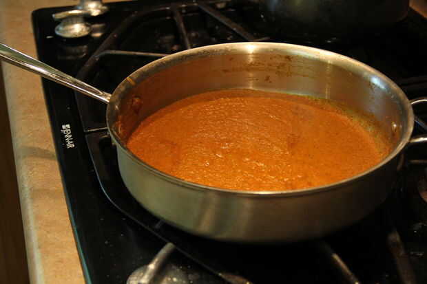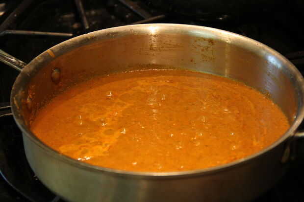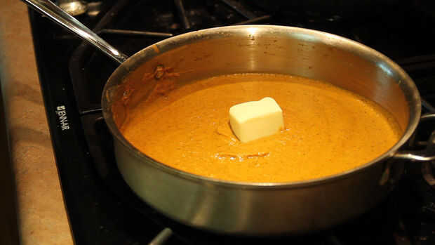Una vez que se espesa un poco... delgada, por supuesto. Duh. Añadir alguna crema o mitad y mitad. Un botón grande de mantequilla. Y si quieres más fino, añadir algo de agua. Y por el amor de pete compruebalo para sal!