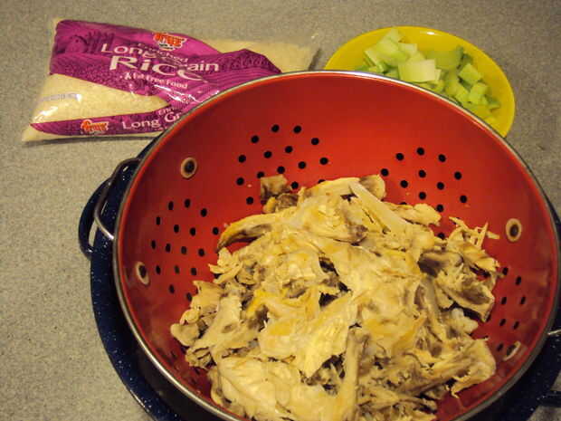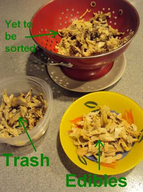 Finalmente, separado del resto del pollo o el pavo de la canal. Colocar en un recipiente y ponerlo en la nevera. Usted puede deshacerse de los huesos y la cebolla ahora.