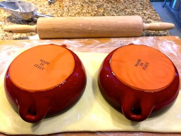 Usando un cuchillo, con cuidado corte la masa de hojaldre (si es demasiado blando para cortar, refrigerar por 20 minutos a la masa de la firma), en el tamaño deseado que necesita para su cazuela o individuo que sirve tazones de fuente.