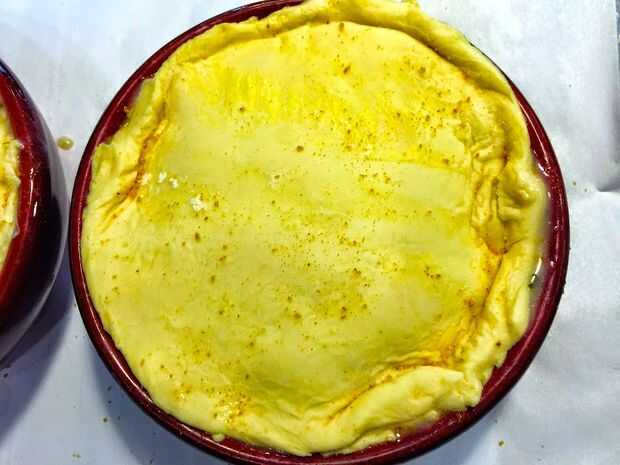 Sacar las hojas de masa de la nevera y con cuidado, coloque la masa sobre la mezcla de pollo, ligeramente... Porque no sellar la masa al recipiente, el vapor se escapa naturalmente.