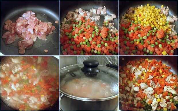 1. en una cacerola, llevar pollo en él. saltear durante 1 minuto.