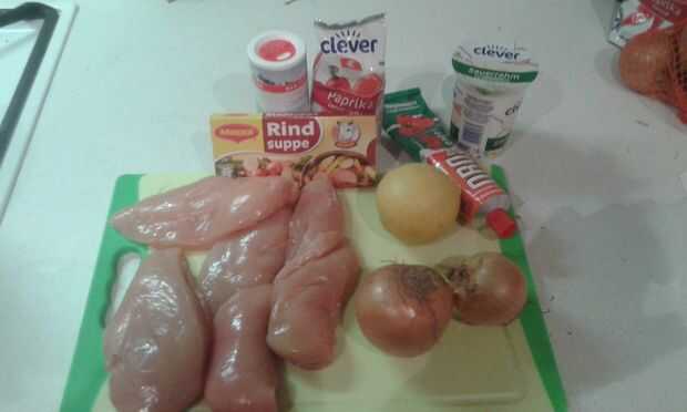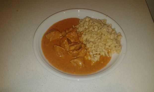 esta receta es muy sencilla y siempre muy popular con mis amigos. Se puede servir sobre arroz o pasta fresca.Necesitarás:pollo en cubosun pimiento rojo cupsicum (pimiento rojo)la mitad de una cebolladiente de ajoun tomate (opcional: le da un gusto mu