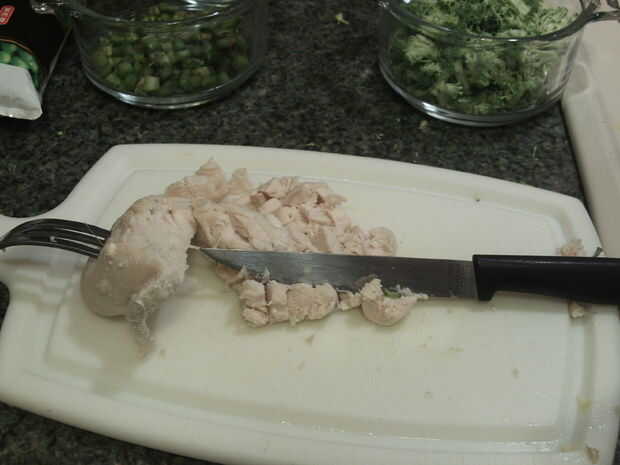 Mientras que se va, saca las pechugas de pollo y cortar en cubos pequeños. 2 tazas de la población de la reserva y el resto de la descarga.