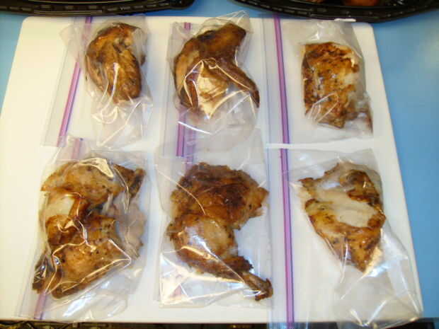 Yo compre varios pollos, usar esquileos de las aves de corral para cortar las espinas dorsales, comer juntos de una comida fresca. Corte el resto de cada pollo por la mitad a lo largo del esternón, quite cada pierna y muslo, conectado, como una porción. Les dejo las alas en su lugar, pero cortar cada pechuga transversalmente para hacer cada uno en dos tramos, el más pequeño tiene ala Unido, no el más grande. Estoy tratando de comer más frutas y verduras en estos días, por lo que cada una de las seis partes es suficiente para una comida para mí. Congelo cada porción en una bolsa zip de congelador un cuarto de galón.