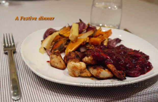 El ayer por la noche, inventé Este festivo pollo con salsa de arándano rojo-naranja-Puerto casero con un toque de canela! Serví con precioso horno asado plato: al horno, chirivías, cebollas rojas y cuñas de la patata dulce! Se trata de una cena festiva y muy deliciosa!