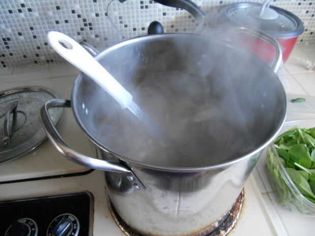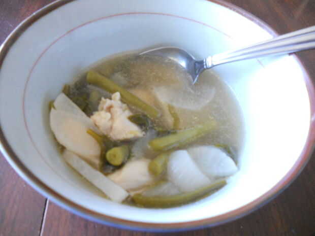 Entonces, añada el jugo de limón y pimienta de limón. Medio limón exprimido en la sopa funciona muy bien. A continuación, cortar la cebolla y echarlo en. Deje que la sopa se a ebullición por unos 5-10 minutos, picar el pollo mientras usted espera y agrega el pollo cuando las rebanadas de daikon empiezan a girar un poco transparente. Lo último que agregas es la espinaca, para que no cocine demasiado. Espere hasta que el pollo haya terminado de cocinar en el caldo y luego mezcle en varios puñados de espinacas. Los dejar cocer por un minuto o dos, seguir revolviendo, y entonces usted está listo para servir!